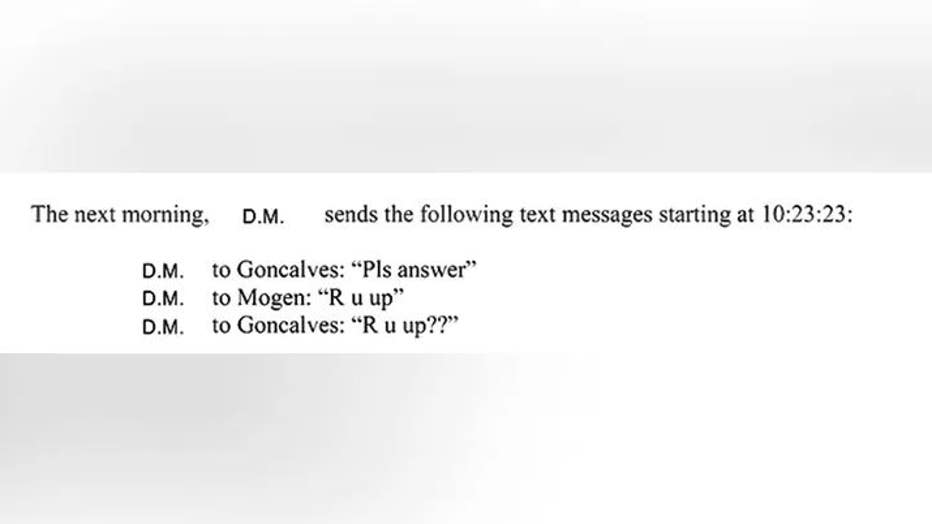 At 10:23 a.m., DM texted both Mogen and Goncalves. "Pls answer," she wrote. "R u up??" She then called her father around 11:40 a.m.
