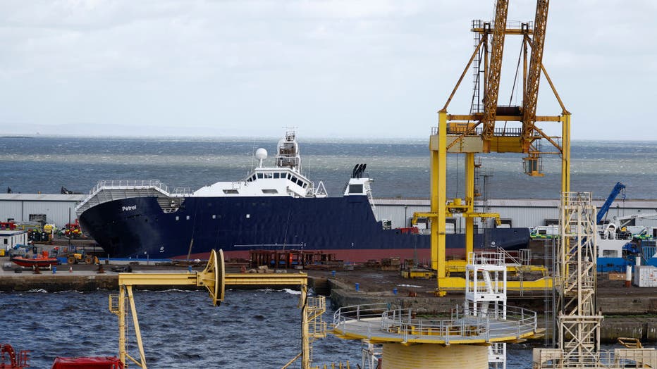 LEITH, SCOTLAND - MARCH 22: Emergency teams attend the scene after a ship tipped over at a 45-degree angle in the Imperial Dock area in Leith on March 22, 2023 at Imperial Dock in Leith, Scotland. Police said the research vessel The Petrel began to t