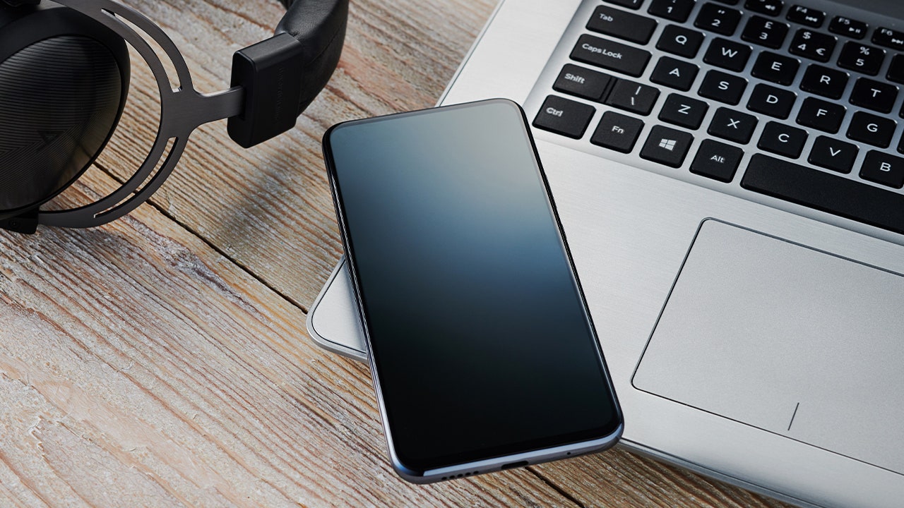 An Android smartphone with a blank screen alongside a laptop computer and pair of over-ear headphones, taken on February 7, 2019. (Photo by Olly Curtis/Future via Getty Images)