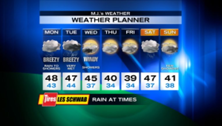 Tuesday will be very wet and breezy, with highs in the upper 40s. Wednesday, we'll still have numerous showers and it gets windier. Thursday and Friday, we'll dry up but get colder with highs only around 40 and overnight lows near freezing. Rain looks likely to return for the coming weekend, with temps warming up enough that lowland snow is unlikely.