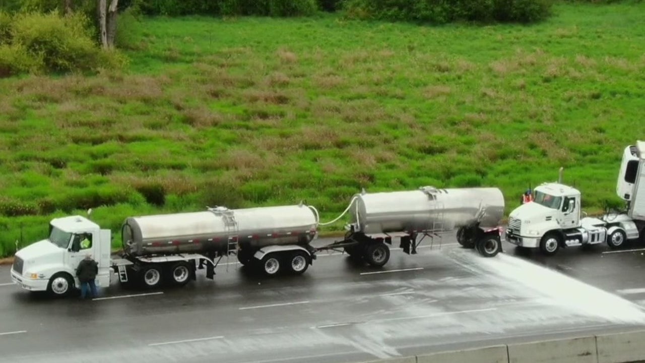 Northbound I-5 reopened after closing for several hours Friday, one semi involved spilled milk across the interstate causing slick conditions. Side streets in Puyallup also saw back-ups as traffic diverted from I-5. Q13 News' Steve Kiggins reports.