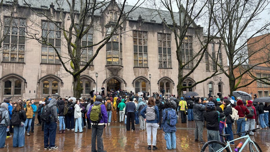 Video and pictures FOX 13 Seattle obtained show hundreds outside of the building, and dozens inside Gerberding Hall.