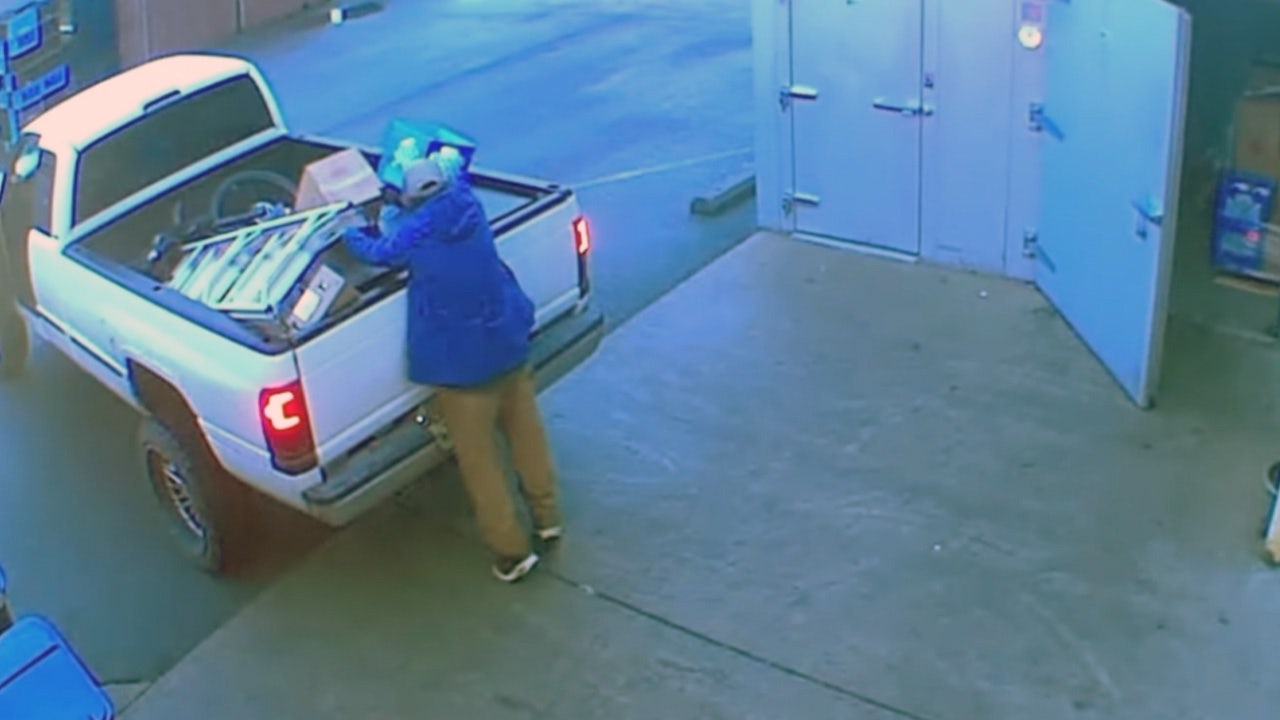 The video shows the suspect making multiple trips in and out of the refrigerator, loading up cases of food into the back of a pickup truck.