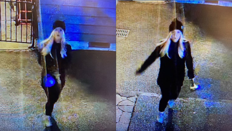 Based on security camera video, the suspect appears to be a white woman with long, straight bleached blonde hair.