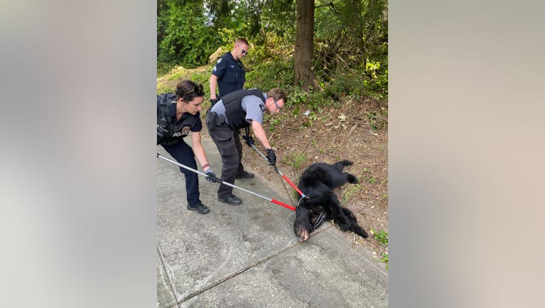 BELLEVUE, Wash. - Bellevue police officers helped rescue a black bear cub from a ditch after a single-car crash Sunday.