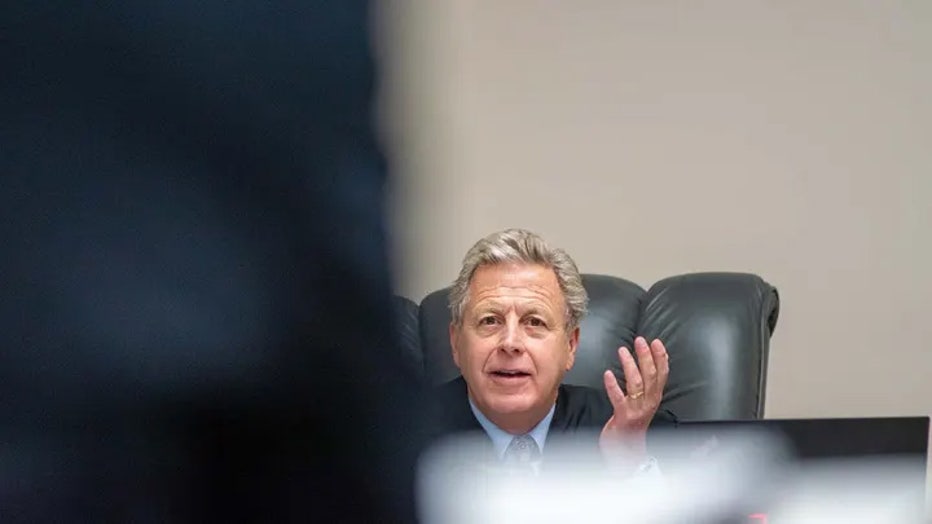 Judge John Judge listens to oral arguments from Bryan Kohberger’s attorney, Jay Logsdon, in court in Moscow, Idaho, on Thursday, Oct. 26, 2023. Kohberger appeared in court in an attempt to overturn his grand jury indictment for the 2022 murders of fo