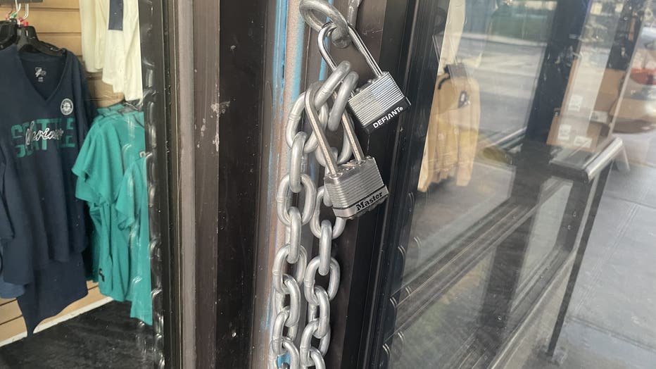 SEATTLE - Three people were caught on camera early Sunday morning breaking into a popular sports fan gear store near Lumen Field and stealing thousands of dollars' worth of Seahawks gear.