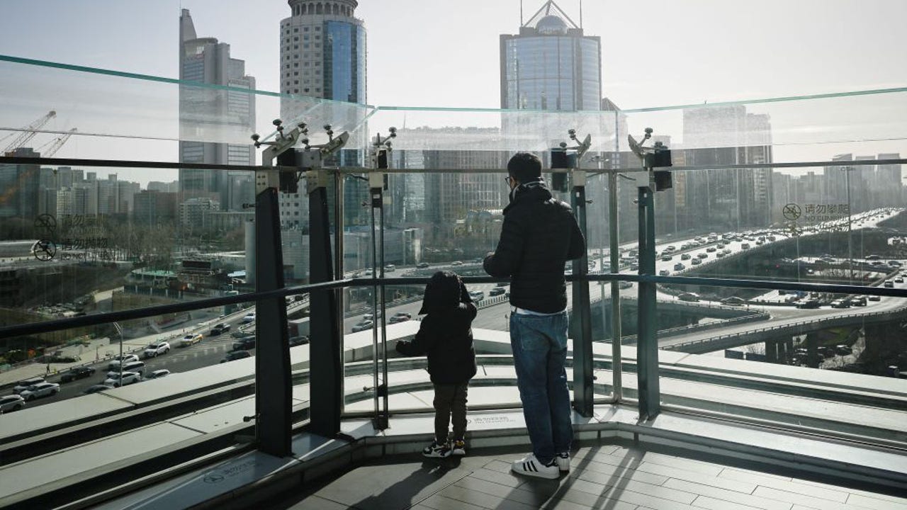 A man and a child look out at the Central Business District (CBD) in Beijing on Jan. 17, 2023. (Photo by WANG ZHAO/AFP via Getty Images)