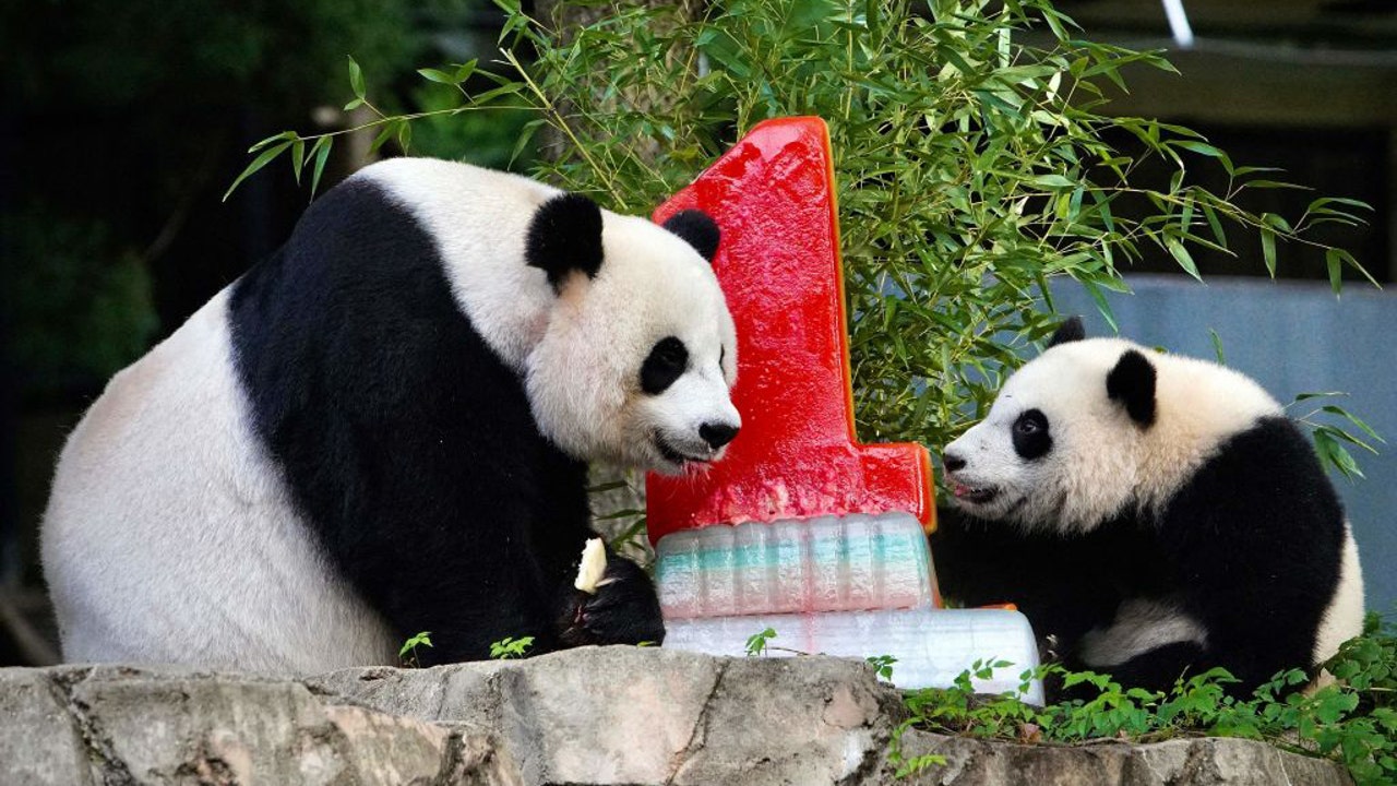 FILE-Giant Panda Xiao Qi Ji (R) celebrates his first birthday with his mother Mei Xiang by eating a fruitsicle cake at the Smithsonians National Zoo in Washington, DC, on August 21, 2021. (Photo by Agnes BUN / AFP) (Photo by AGNES BUN/AFP via Getty I
