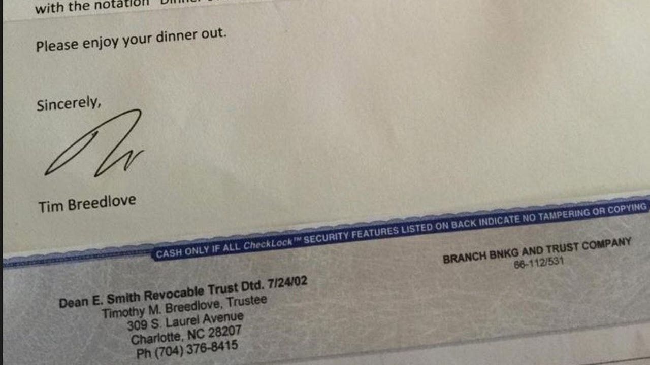 "Each player was important and special to Coach Smith and when he prepared his estate plan, Coach wanted to reach out to each of his letterman. Accordingly, Coach directed that following his passing, each letterman be sent a two hundred dollar ($200.00) check with the message "enjoy a dinner out compliments of Coach Dean Smith." Enclosed is a check in the amount of two hundred dollars ($200.00) with the notation "Dinner out."
