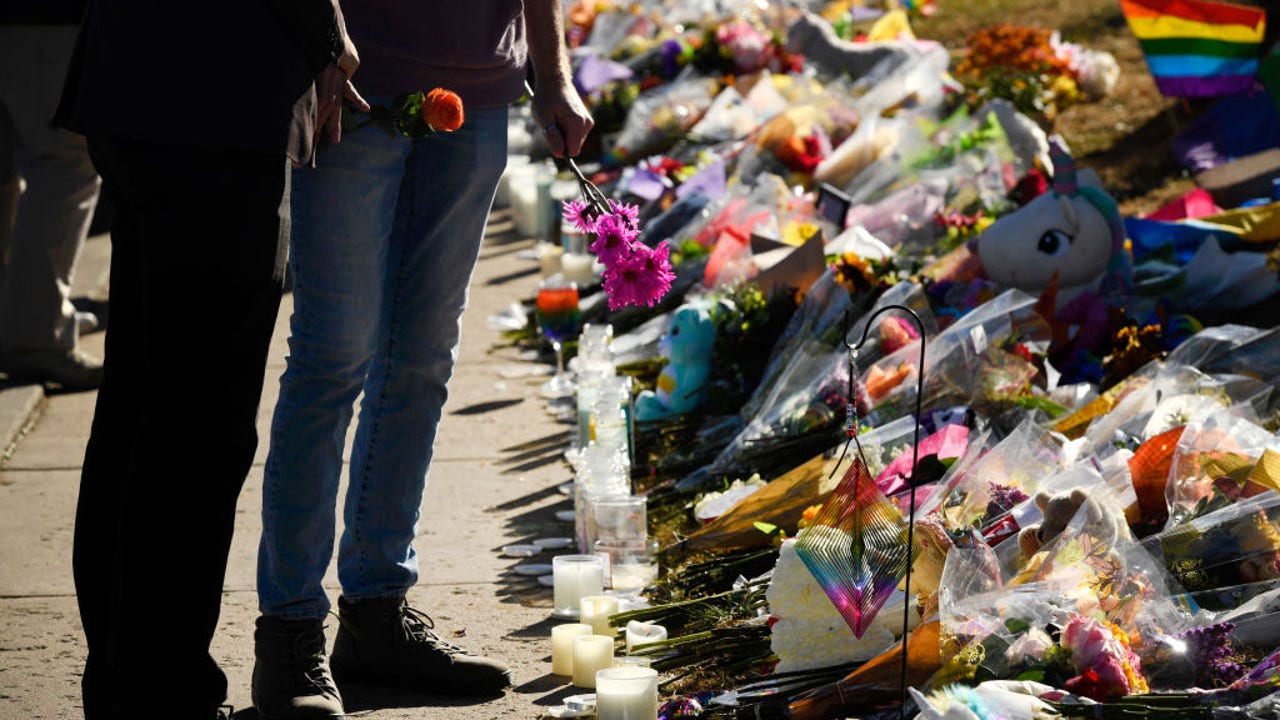 A mourner brings flowers to leave at the growing memorial where hundreds of flowers, balloons, signs and remembrances have been left for the victims of the Club Q shooting on November 21, 2022 in Colorado Springs, Colorado. (Photo by Helen H. Richard