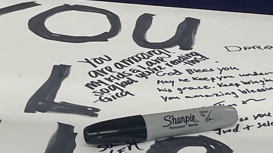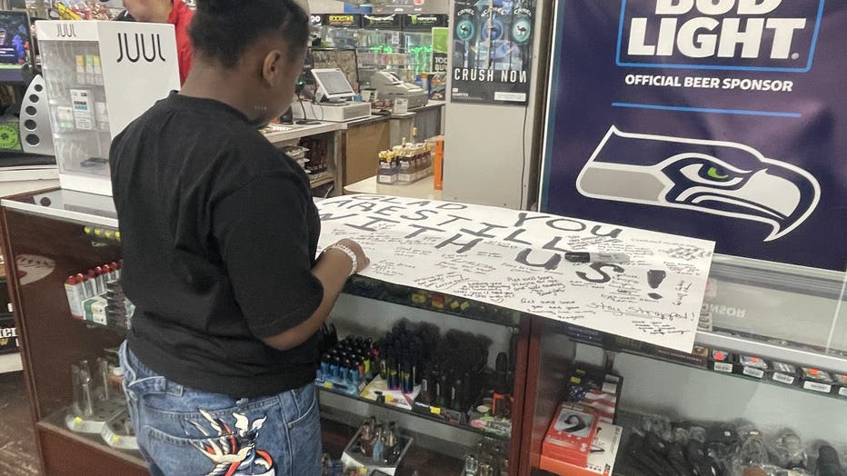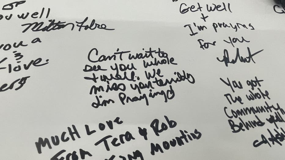 On Monday, Erica and her daughter Aubrie added their names and well-wishes to a large get-well card available to sign at his store.