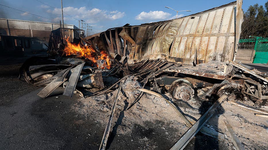 A view of a burning truck, allegedly set on fire by organised crime groups in response to an operation to arrest a high-priority security target, on a highway near Acatlan de Juarez, Jalisco state, Mexico on February 22, 2026. The Mexican army announ
