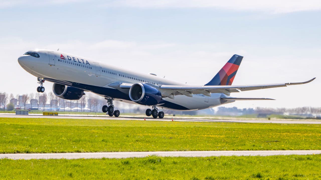Delta Air Lines Airbus A330neo or A330-900 aircraft with neo engine option of the European plane manufacturer, as seen departing from Amsterdam Schiphol AMS EHAM International airport from Polderbaan runway and flying in the blue sky. (Photo by Nicol