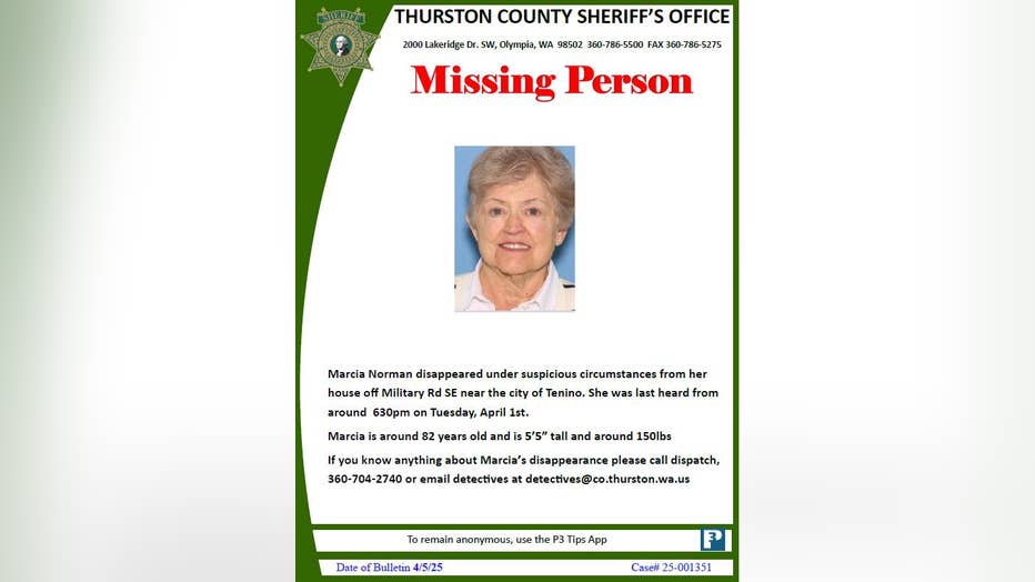 Thurston County Sheriff’s Officials say no one has seen or heard from 82-year-old Marcia Norman since Tuesday, April 1.
