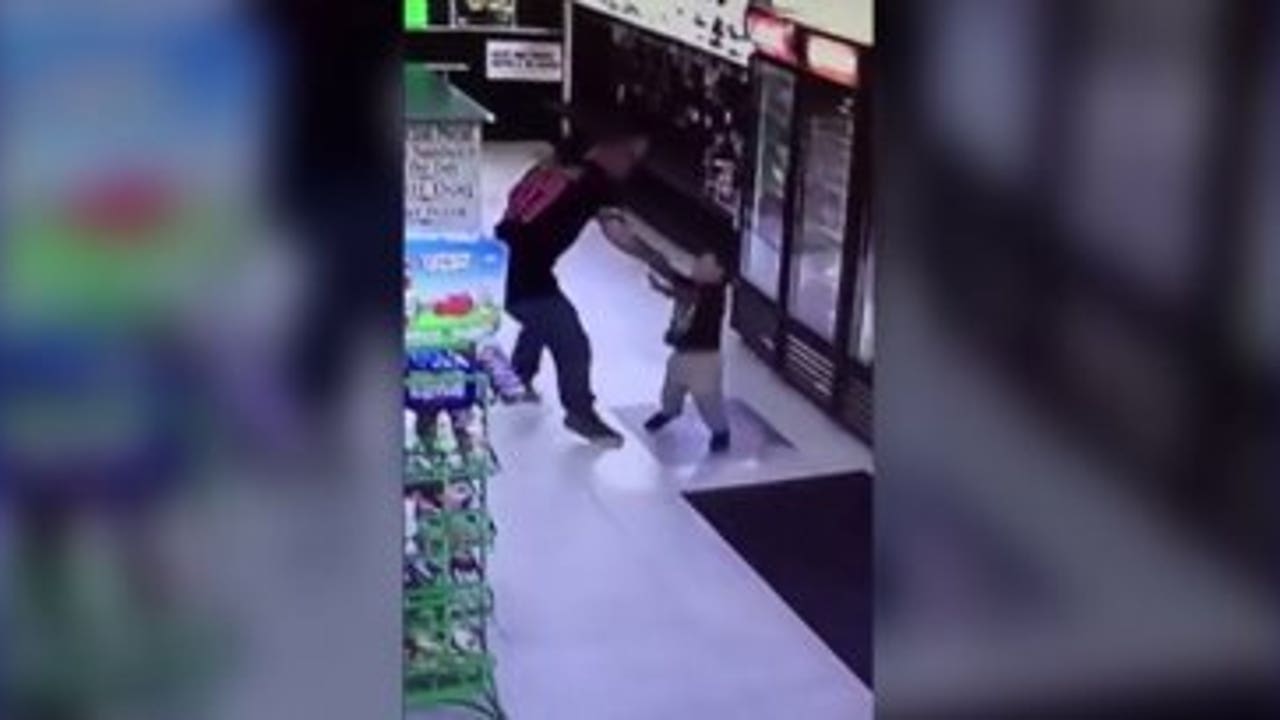 The video shows him running through the aisles of the store. The man runs after the boy, hits him in the face, then picks him up off the ground.