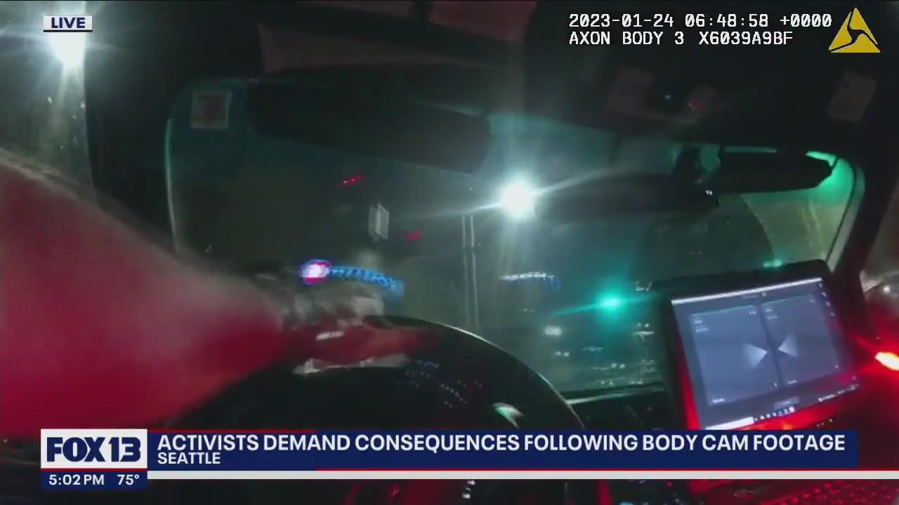 SEATTLE - Dozens of people hit the streets Thursday protesting Seattle Police, after body camera footage showed an officer laughing and making jokes about a woman killed by a speeding patrol car.