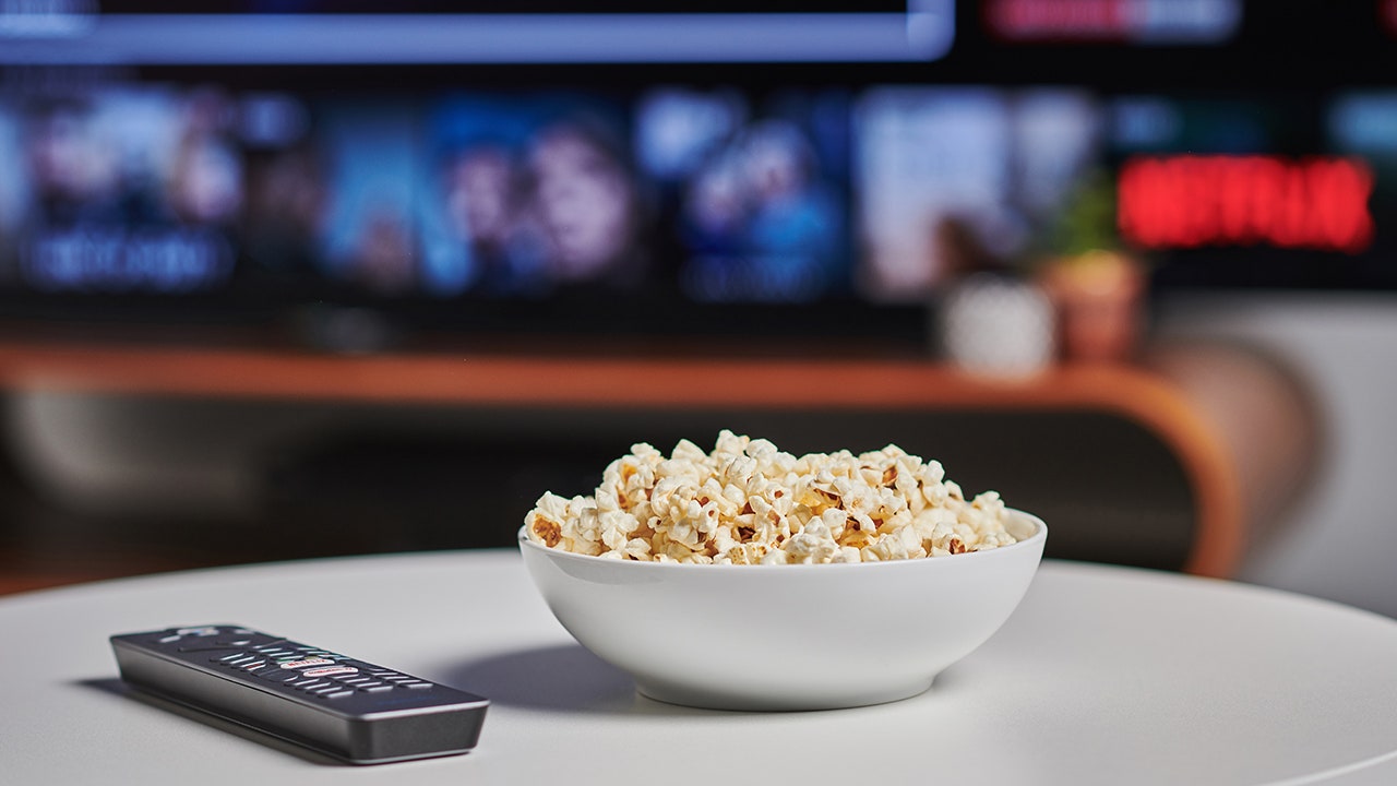 A bowl of popcorn and TV remote control on a coffee table, with Netflix streaming on a television in the background, taken on March 6, 2020. (Credit: Phil Barker/Future Publishing via Getty Images)