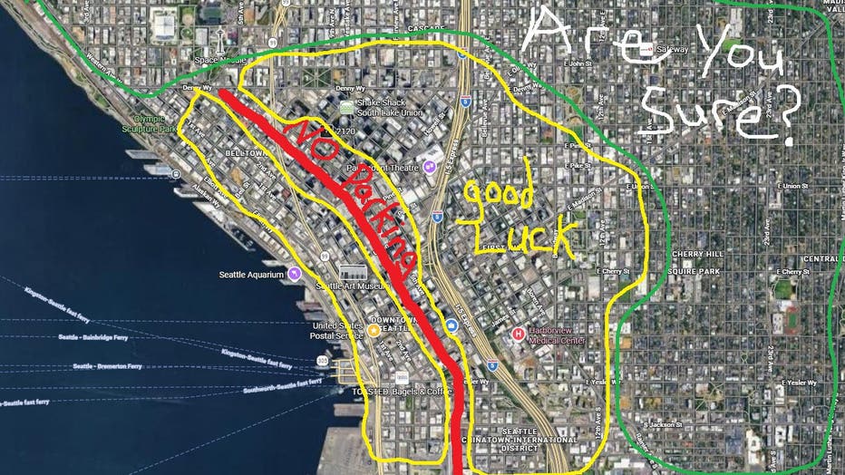 Cheeky map showing the likelihood of finding parking ahead of the Seahawks Super Bowl parade.