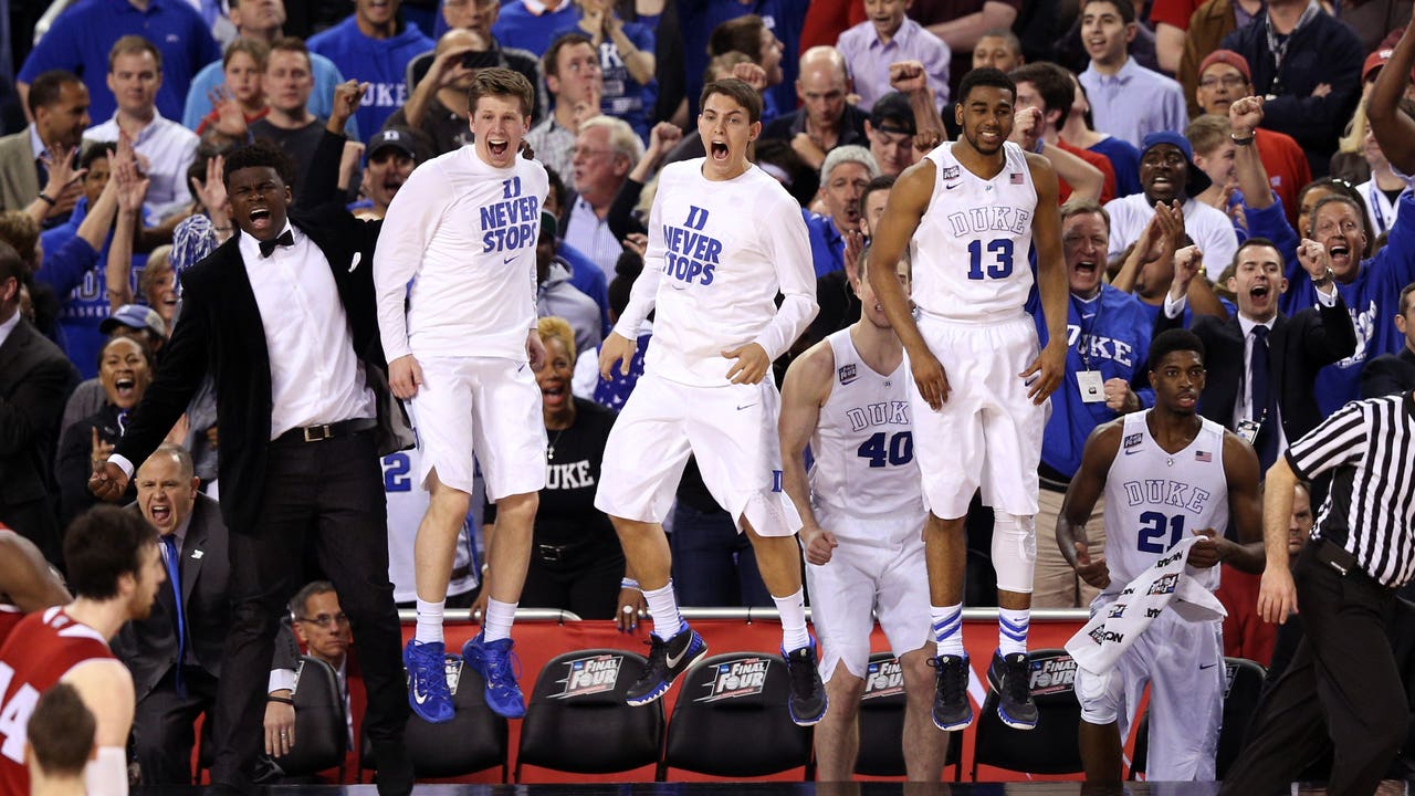 The Duke Blue Devils bench celebrates late in the game against the Wisconsin Badgers during the NCAA Men's Final Four National Championship at Lucas Oil Stadium on April 6, 2015 in Indianapolis, Indiana. (Photo by Joe Robbins/Getty Images)