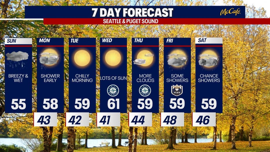 SEATTLE - Today will feel especially fall-like. We're already starting out with dark skies and some light showers throughout the region. Expect more wet weather and breezy conditions heading into this afternoon. Temperatures will peak in the mid-50s today.