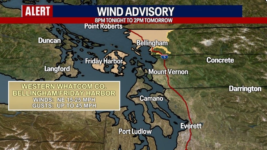 NWS Seattle issued a Wind Advisory for these spots, including Bellingham and Friday Harbor. Speeds could reach up to 25 mph with potential gusts up to 45 mph.