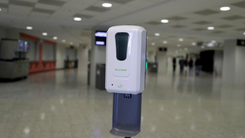 FILE - Hand sanitizer is seen on the concourse at the Prudential Center on Jan. 16, 2021 in Newark, New Jersey. (Photo by Elsa/Getty Images)