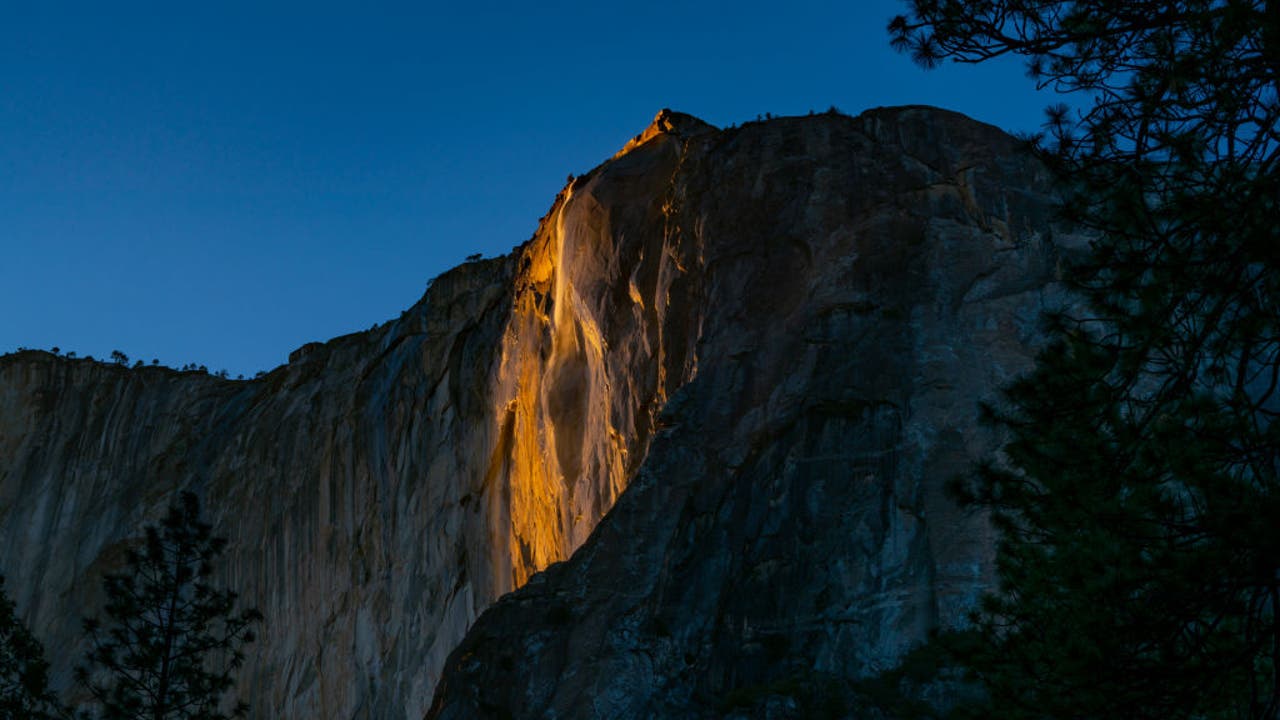 General views of the Yosemite Firefall natural phenomenon at Horsetail Fall ending in a pinkish hue on February 24, 2021 in Yosemite, California. (Photo by AaronP/Bauer-Griffin/GC Images)