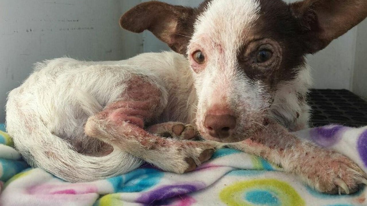 A sick dog who was abandoned then discovered by a good Samaritan in Fontana was recovering on Dec. 9, 2014. (KTLA)