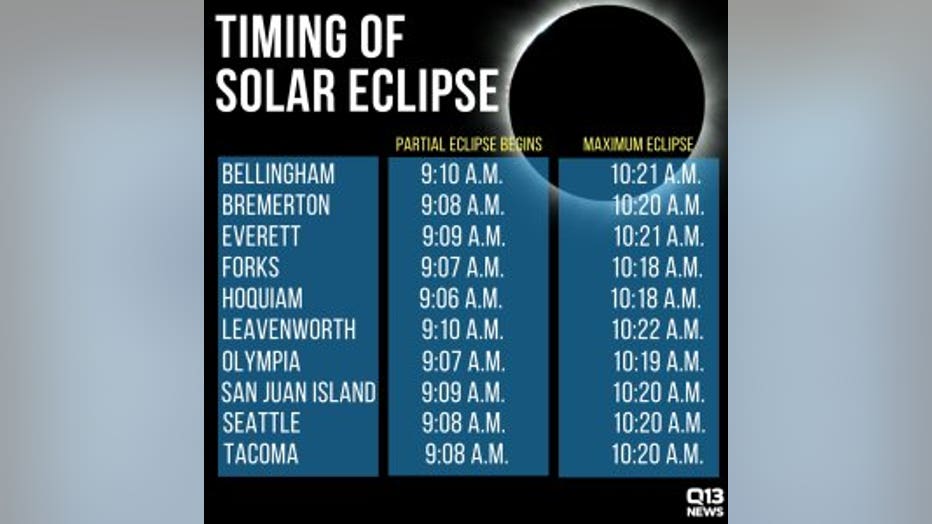 How long does it last? The whole sky show lasts for a few hours. But the big event happens at 10:21 a.m.in Seattle. That's when the eclipse will be at the peak with about 92% of the sun covered by the shadow of the moon. That peak only lasts a few minutes.