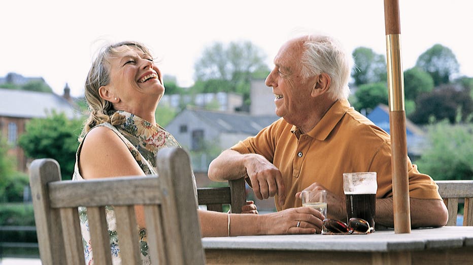 FILE: An elderly couple sit outside and enjoy a drink at a local bar.(Credit: Bryn Colton/Getty Images)