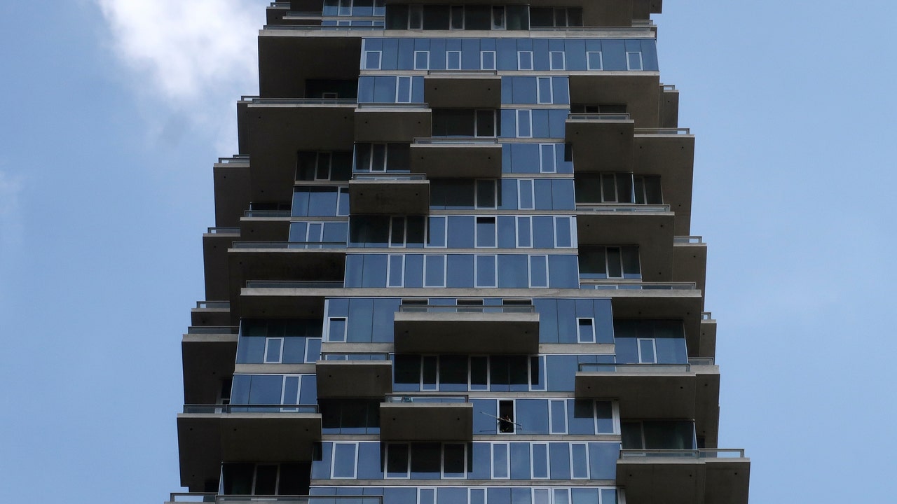 A cleaner washes a window in a condominium known as the "Jenga Building" on October 3, 2016 in New York City. (Photo by Gary Hershorn/Getty Images)