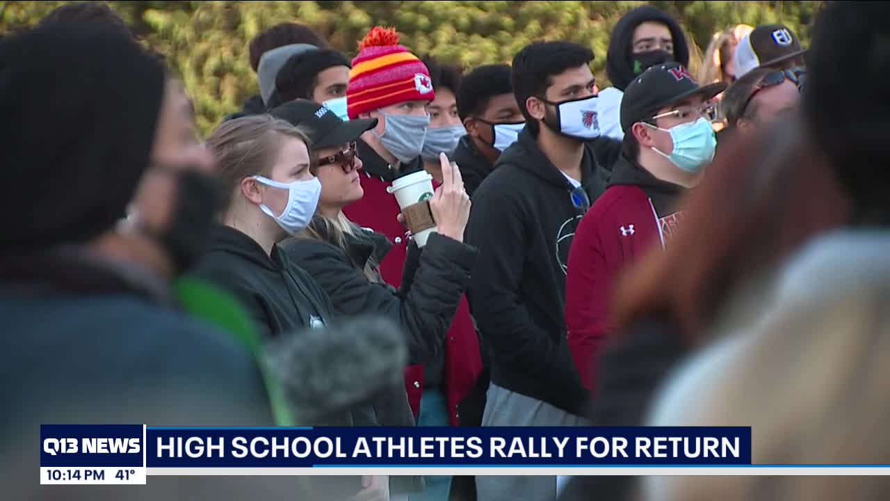 High school student-athletes and parents held a rally outside the Kent School District to voice their desire to return to sports as soon as possible.