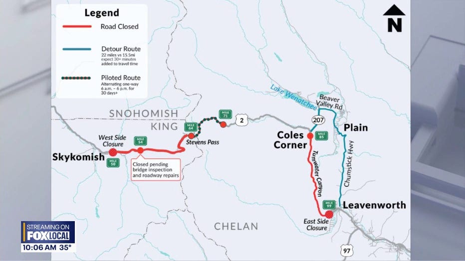 The highway also remains closed in Tumwater Canyon from east of Coles Corner to Leavenworth. Repairs in that area began Dec. 23, and traffic is being detoured onto Chumstick Highway, a rural county road with lower speed limits and bridge restrictions. Drivers are advised to plan for longer travel times.