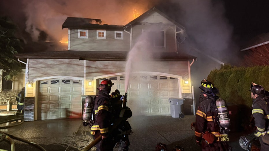 According to Puget Sound Fire, crews responded to a house fire in the 12500 block of South 259th Street near the Green River. Crews shared photos of the scene on social media just after 2 a.m.