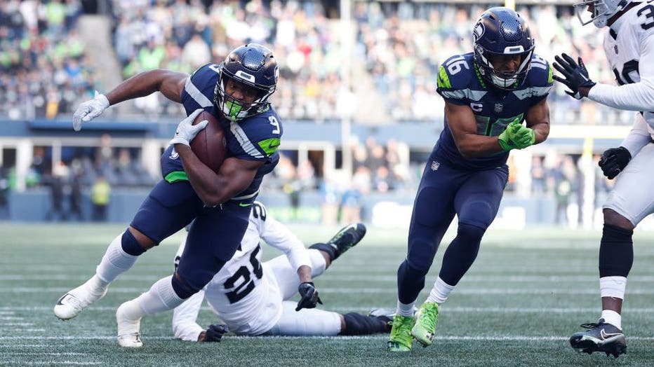 SEATTLE, WASHINGTON - NOVEMBER 27: Kenneth Walker III #9 of the Seattle Seahawks runs with the ball in the first quarter against the Las Vegas Raiders at Lumen Field on November 27, 2022 in Seattle, Washington. (Photo by Steph Chambers/Getty Images)