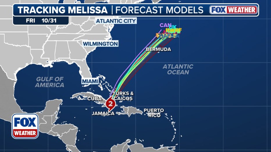 FOX Weather reports Melissa is forecast to track northeast into the Atlantic before brushing by Bermuda, avoiding a direct hit on the island.