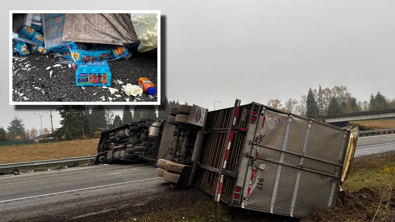 I-5 North WA traffic blocked by overturned semi-truck filled with juice