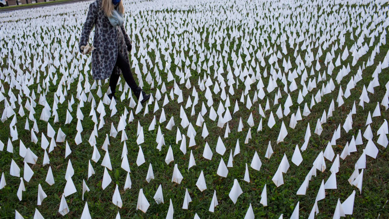 On the eve of the 2020 Presidential election, artist Suzanne Brenan Firstenberg sits in the COVID-19 memorial she conceived on November 2, 2020 outside of RFK Stadium in Washington, D.C.