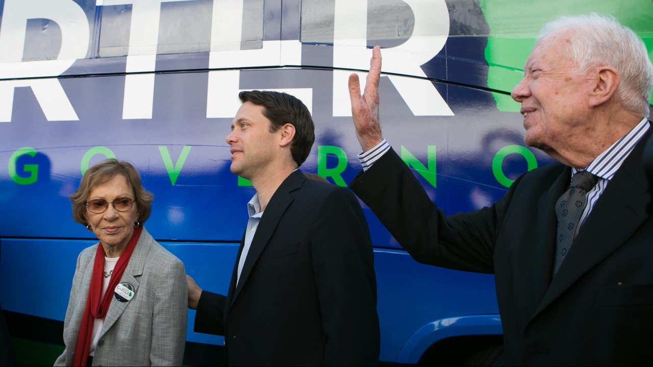 Georgia Democratic gubernatorial candidate and State Sen. Jason Carter (C) arrives at a campaign event with his grandparents, former U.S. President Jimmy Carter (R) and former first lady Rosalynn Carter, at Emmanuel Christian Community Church on Octo