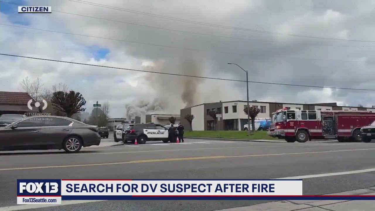 KENT, Wash. - Kent Police are searching for a man accused of domestic violence, who escaped arrest as his workplace went up in flames.