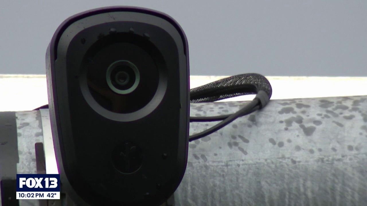 A Flock Safety camera sits atop a traffic light on Feb. 23, 2026. (FOX 13 Seattle)
