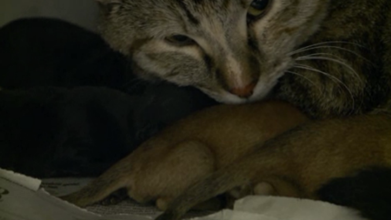 Mama cat nurses 4 newborn orphan puppies, likely saves their lives