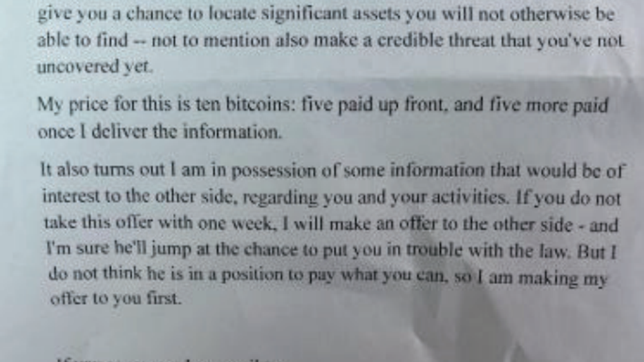 Court documents stated, "The letter was an attempt to extort cryptocurrency from the victim in exchange for information he could use in an ongoing lawsuit."