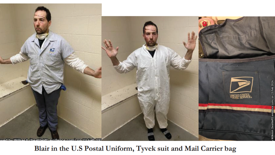 Police say Blair was also wearing a white Tyvek suit under the U.S. Postal Service (USPS) uniform and carried USPS bag.