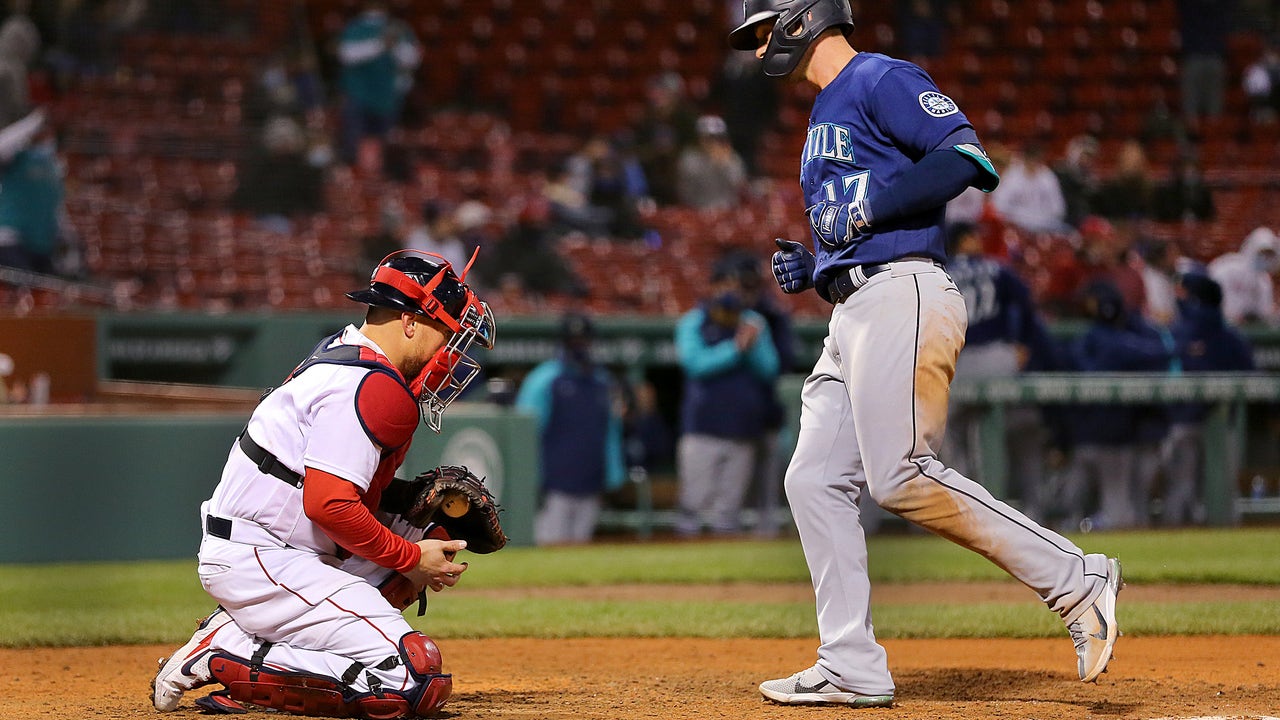 Boston - April 22: Boston Red Sox catcher Christian Vazquez (7) doesnt look up as Seattle Mariners right fielder Mitch Haniger (17) crosses home plate safely after hitting a 3-run homer in the 10th inning during a regular season MLB game against the