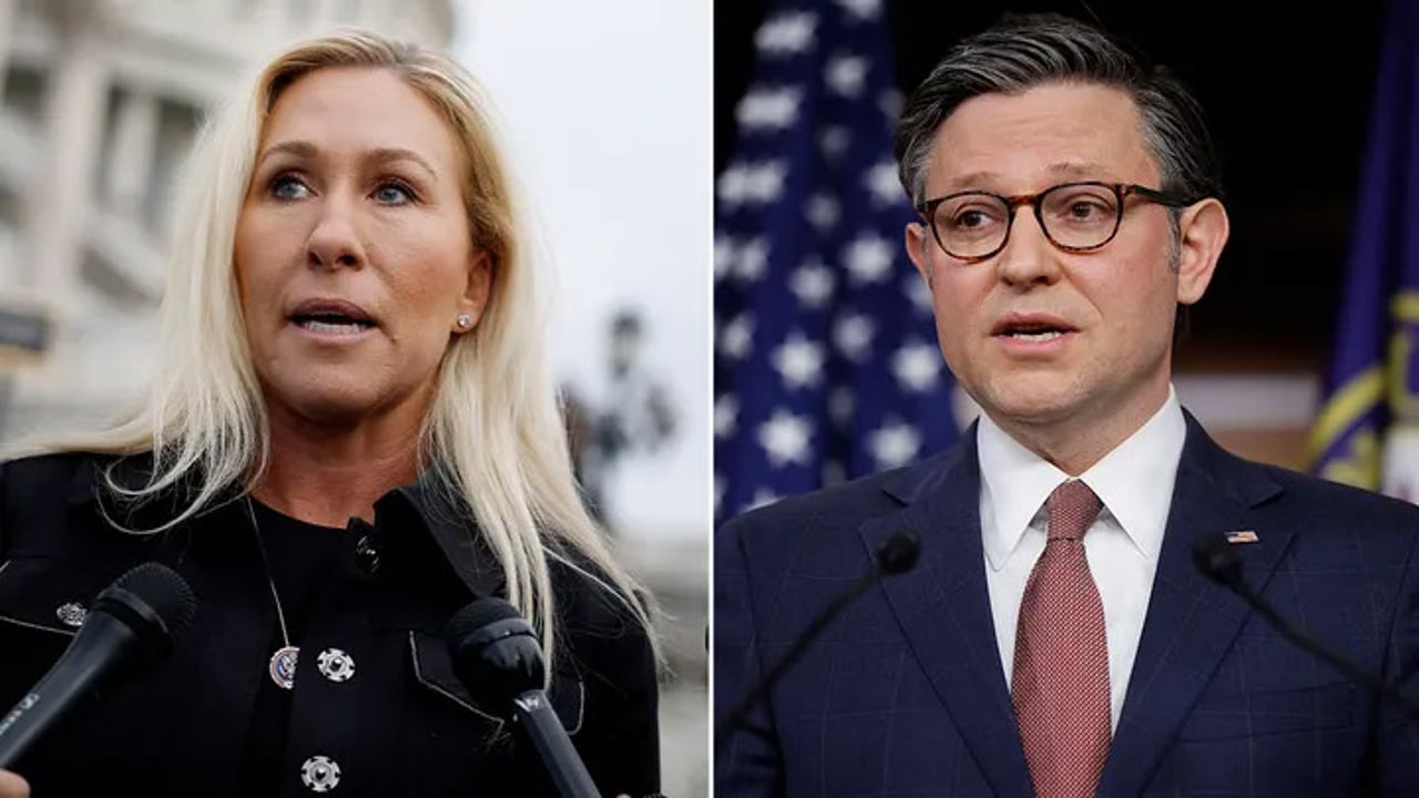 Rep. Marjorie Taylor Greene, left, and House Speaker Mike Johnson. (Getty Images)