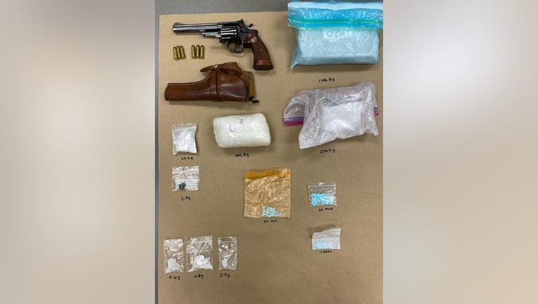 Law enforcement say they found a loaded .357 revolver on the suspect, as well as large amounts of suspected fentanyl powder and methamphetamines, and packaging material commonly associated with the sale of narcotics.