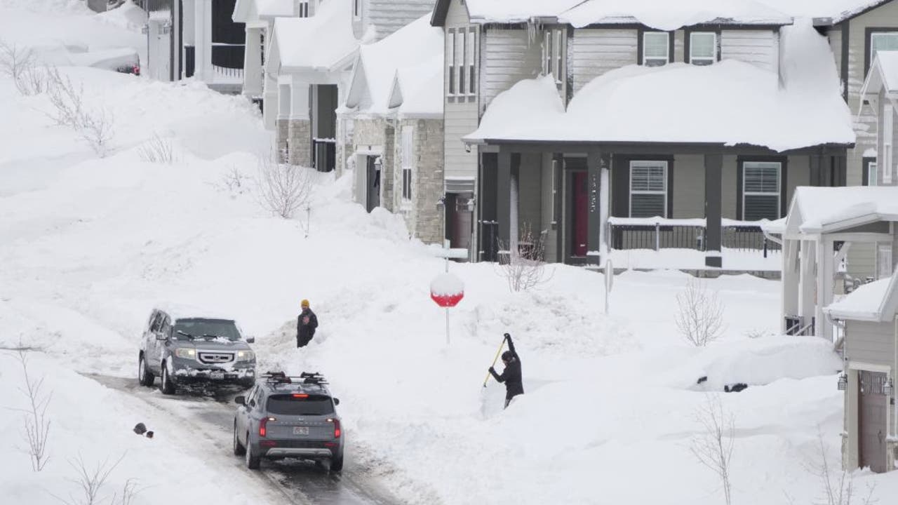 Cars try to make their way up and down a street as people try and dig out form feet of snow that fell in Draper, Utah, on February 23, 2023. - Powerful winter storms lashed the United States on February 22, 2023, with heavy snow snarling travel acros