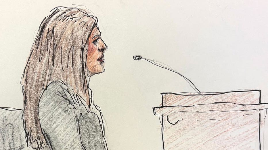 Melissa Buss, Milwaukee County Assistant District Attorney, testifies in the Judge Hannah Dugan trial on Wednesday, Dec. 17. Sketch courtesy Adela Tesnow.